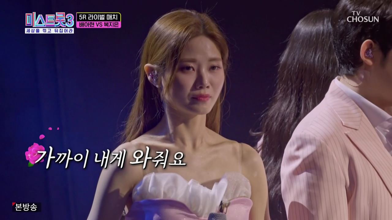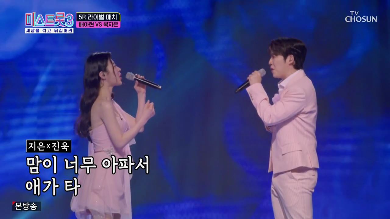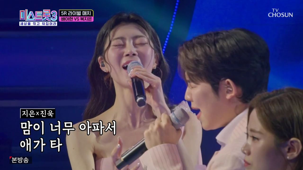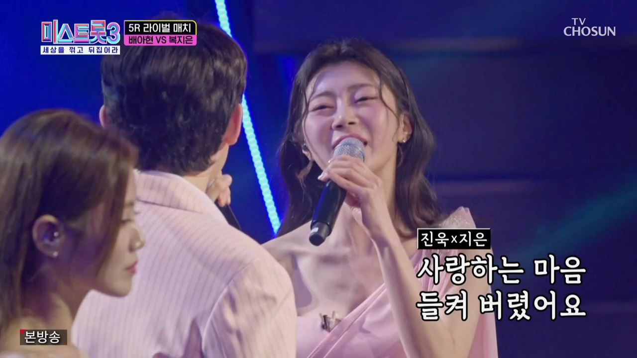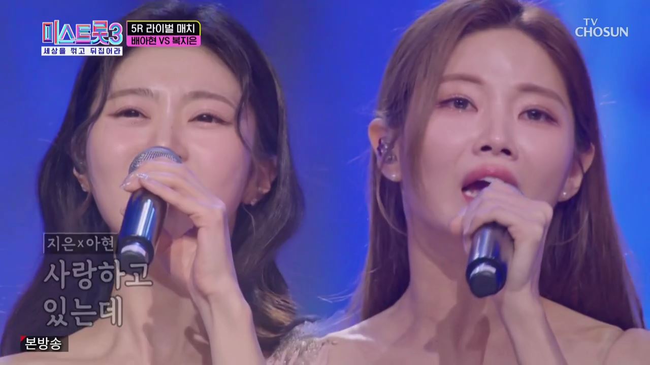 아니 왜냐하면 아현 씨의 목소리에서는 한이 느껴졌고 돌아봤을 때 지은 씨를 만났을 때는 지은 씨는 약간 떨림과 설렘과 이런 또 목소리가 있어서 보는 사람들로 하여금 이렇게끔 느끼게 만든 것 자체가 완벽한 무대였다. 여기까지입니다.