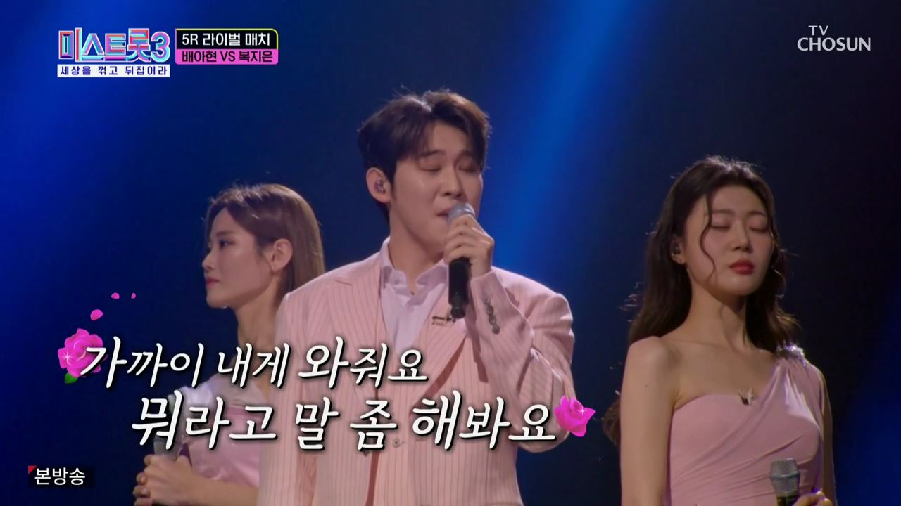 아현 씨는 그 주 무기인 그 정통적인 그런 기교나 이런 것들을 많이 죽였고, 복지은 씨는 또 성악 발성을 많이 죽여서 지금 같이 하다 보니까 1절에서는 약간 둘이 비슷한가 이런 느낌마저 들게 합이 굉장히 좋아 보이다가 이제 마지막에 두 분만 했던 부분이 있잖아요.
