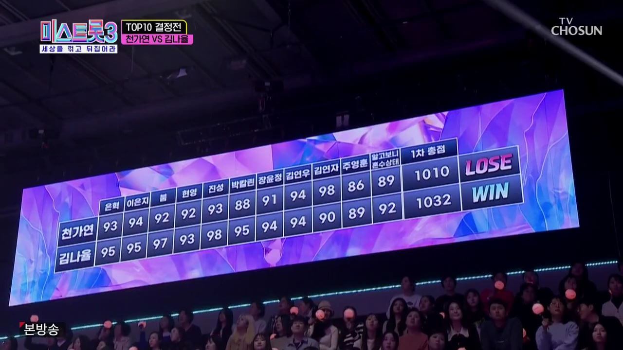 1차전에서 두 분의 점수는 김나율 씨가 1019점, 천가연 씨가 1018점이었습니다.
